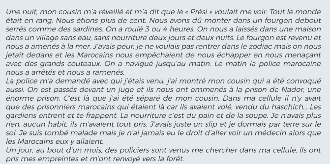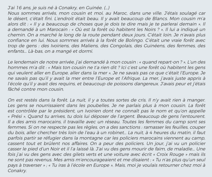 le témoignage d'un jeune Guinée qui raconte son parcourt, sans figure de style. le petit livre se lit vite, mais il m'a fallu des pauses pour le digérer émotionnellement ...