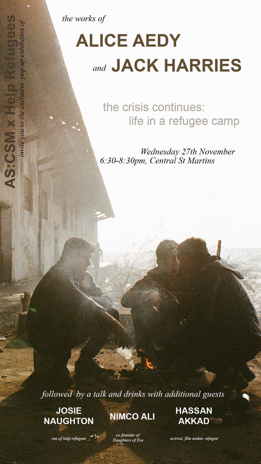 Join us in London on 27 November at an intimate photography exhibition by @JackHarries & @AliceAedy with our ambassadors @NimkoAli & @hassan_akkad & Help Refugees co-founder Josie Naughton eventbrite.co.uk/e/ascsm-x-help…